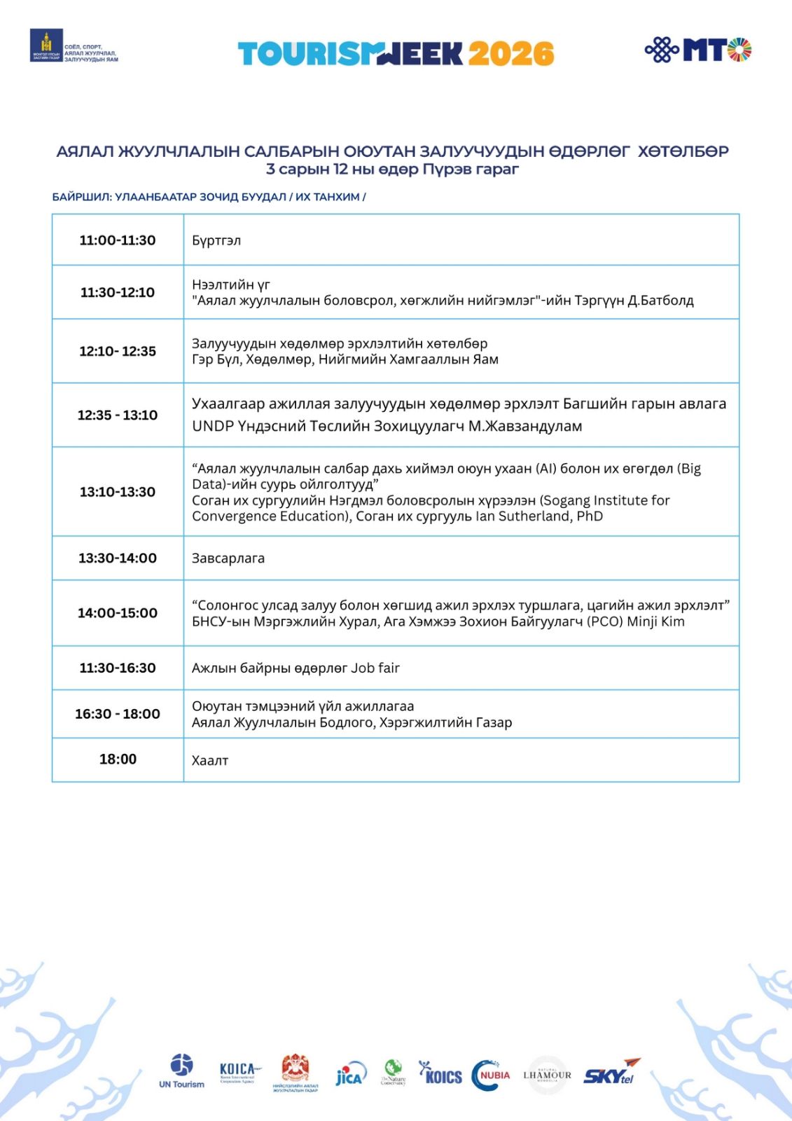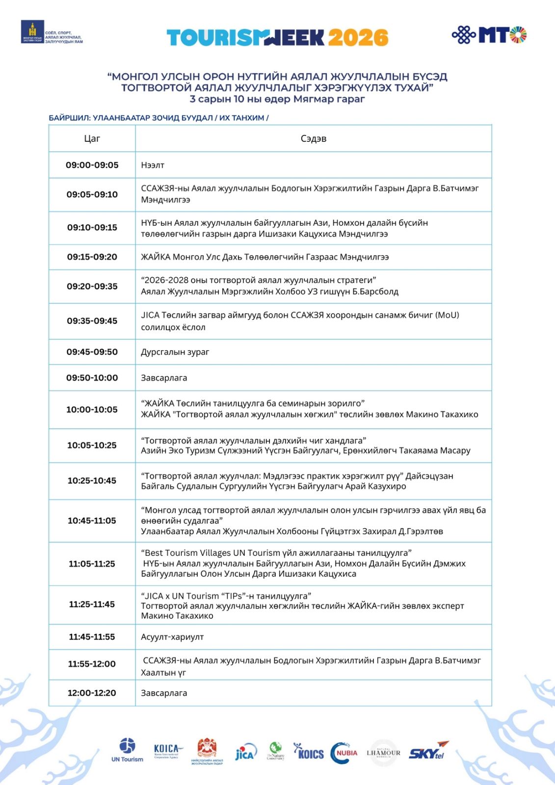 Хөтөлбөр (Өдөр 1): Аялал жуулчлалын үндэсний чуулган